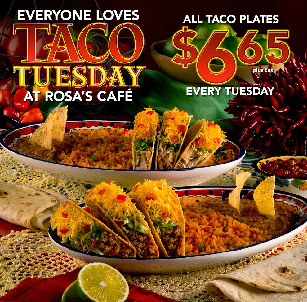 Everyone loves Taco Tuesday at Rosa's Cafe. All Taco Plates are only $6.65 every Tuesday.